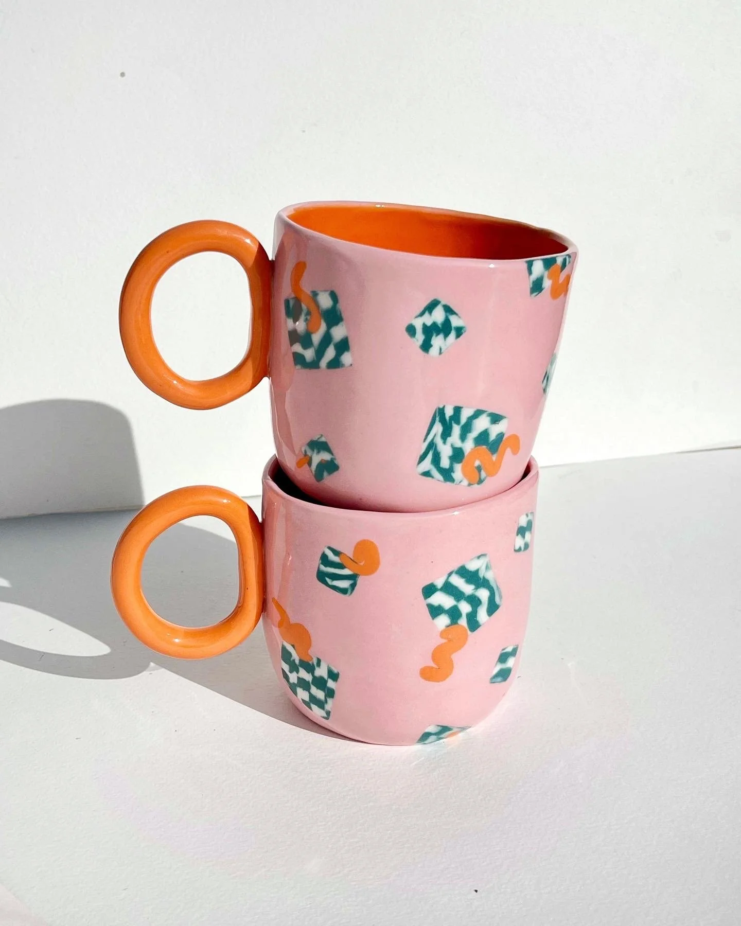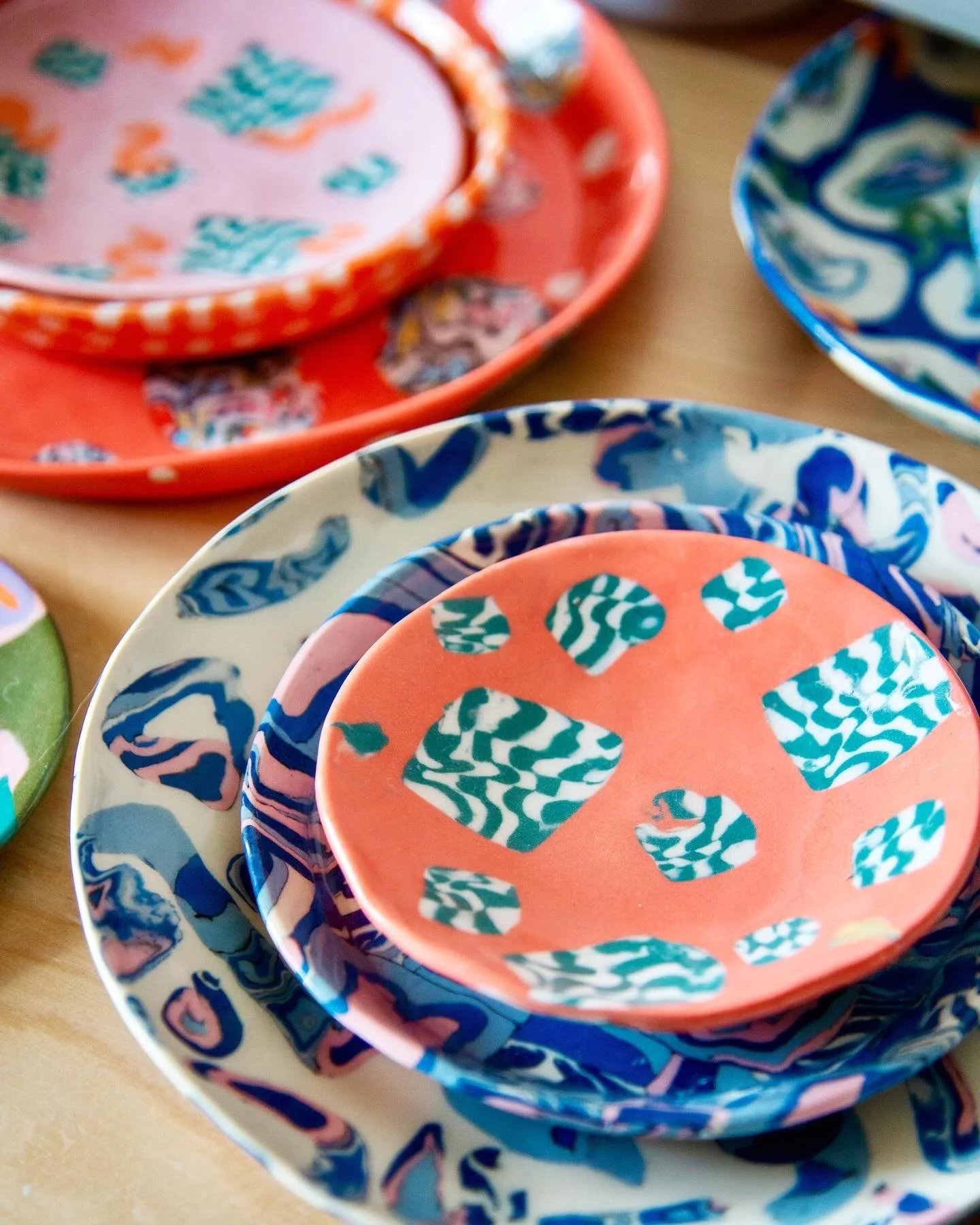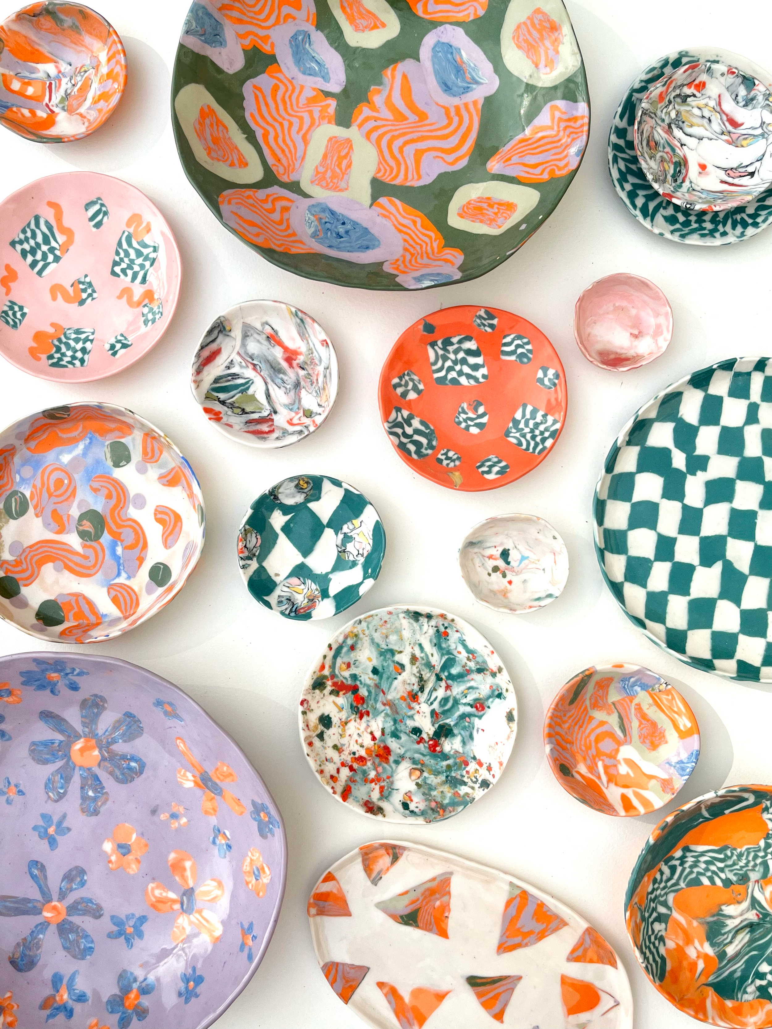 Victoria, the maker behind Swimmer Studio, has a BFA from Parsons School of Design & has been working with clay for over 10 years. She specializes in the technique of nerikomi; creating patterns out of colored porcelain clay and handbuilding functional objects.
