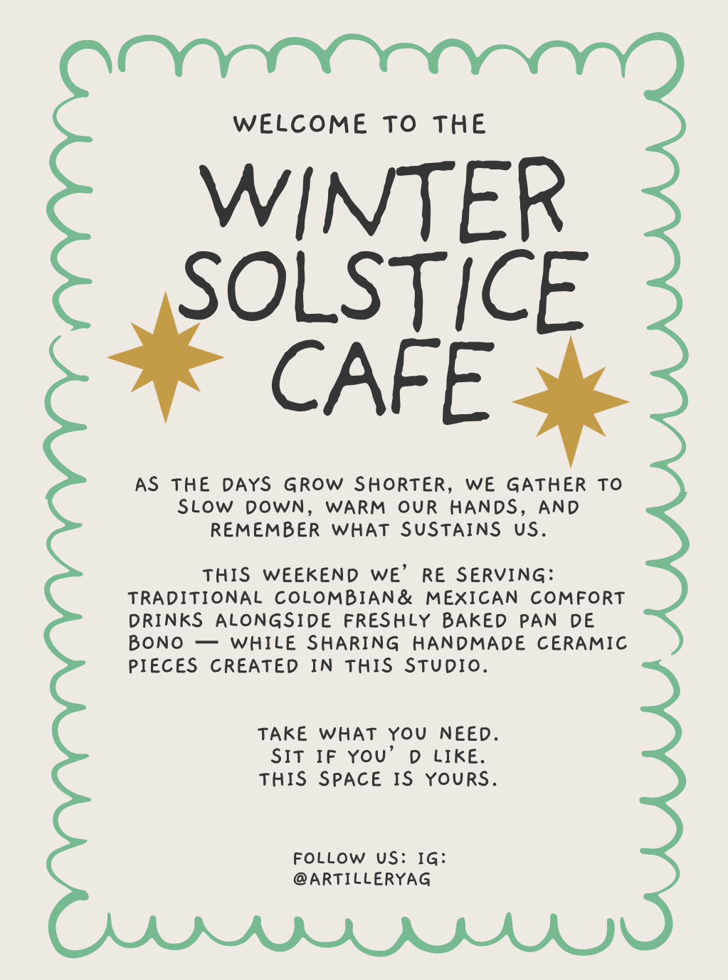 This Sunday, December 21, 2025, Artillery AG + Ceramics Studio is hosting a Winter Solstice Café Pop-Up & Holiday Sidewalk Sale, inviting neighbors, friends, and passersby to slow down, warm their hands, and gather intentionally.